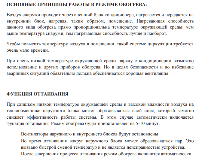 Tous les modèles muraux ont une fonction de chauffage des locaux. Dans le même temps, la puissance est de 7 à 10 % inférieure à la capacité de refroidissement. Cette option n'est pas disponible pour les modèles de fenêtre - ils sont conçus uniquement pour la climatisation à froid et le fonctionnement en mode ventilation.