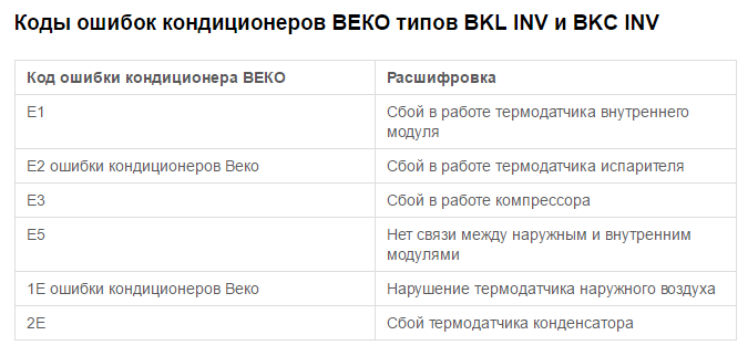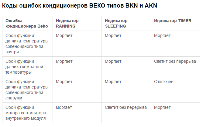 Tous les modèles BEKO modernes sont équipés d'un système d'autodiagnostic innovant qui, en cas de dysfonctionnement ou de fonctionnement incorrect des principales unités de travail, active le blocage de l'ensemble de l'appareil et signale simultanément la cause du dysfonctionnement en affichant certains codes d'erreur des climatiseurs BEKO. Lorsqu'un dysfonctionnement est détecté dans le fonctionnement de l'appareil, les LED d'affichage s'allument en continu ou clignotent dans une certaine séquence, qui correspond à l'erreur détectée.