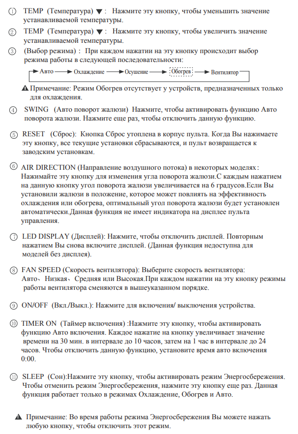 - Modes de fonctionnement du climatiseur et leur objectif. Une description détaillée de toutes les possibilités. Cette section décrit ce que font certains des boutons de la télécommande et ce dont ils sont responsables.