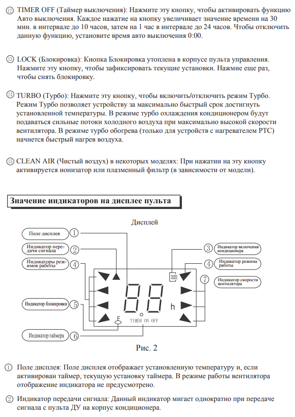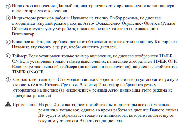 - Spécificité des détails. Description de l'unité extérieure et intérieure, désignation des indicateurs sur le panneau ;