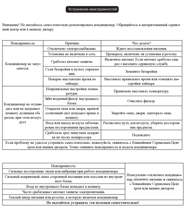 - Dysfonctionnements possibles et réparation du climatiseur.