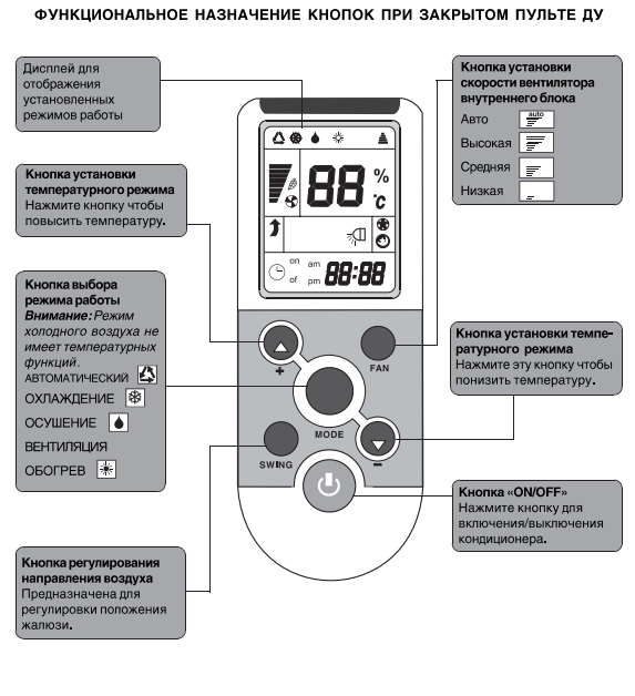 La télécommande est une solution très pratique et moderne. La température intérieure peut changer au cours de la journée, car le temps à l'extérieur de la fenêtre ne reste pas à un niveau, et chaque fois que vous vous approchez de l'unité intérieure pour un réglage optimal des modes, vous détournez l'attention de questions plus importantes. Il est également très pratique dans les cas où le système split est très haut au-dessus du sol. Le manuel d'un tel appareil informe l'utilisateur de plusieurs règles de fonctionnement importantes :