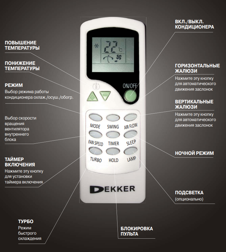 Étant donné que tous les équipements climatiques Dekker sont contrôlés à partir de la télécommande, il sera utile de lire la section suivante, qui décrira les instructions pour le climatiseur Dekker, les informations sur la façon d'allumer le climatiseur et la fonctionnalité des boutons de la télécommande .