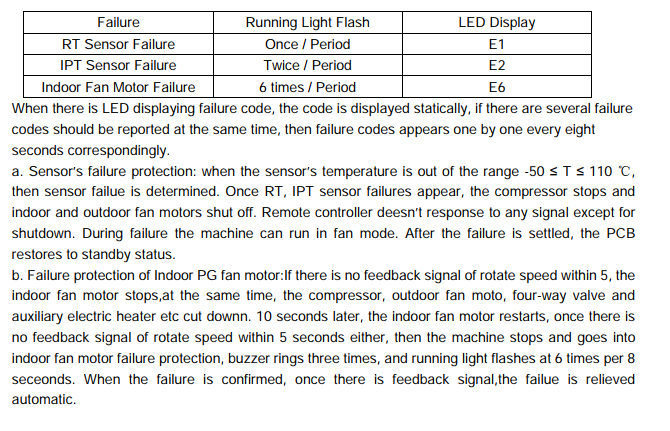 En cas d'installation incorrecte ou de violation des recommandations d'utilisation du fabricant, les systèmes Decker peuvent tomber en panne, ce qui sera indiqué par le code d'erreur affiché sur l'écran de l'unité intérieure. Les informations avec un déchiffrement sur le code d'erreur contiennent les instructions du climatiseur Dekker. Il est présenté sur la photo suivante et aidera à déterminer les causes du dysfonctionnement, les remèdes et les contacts des centres de service.