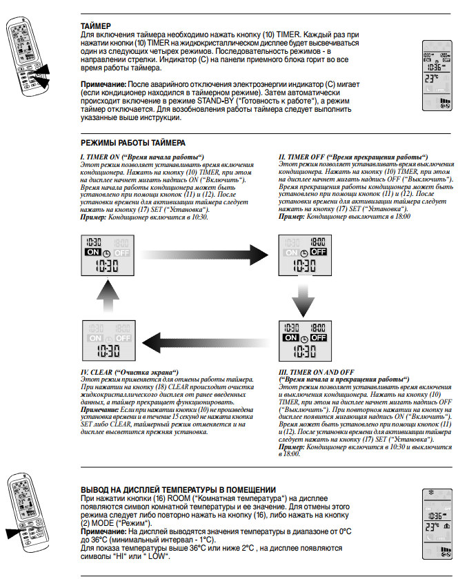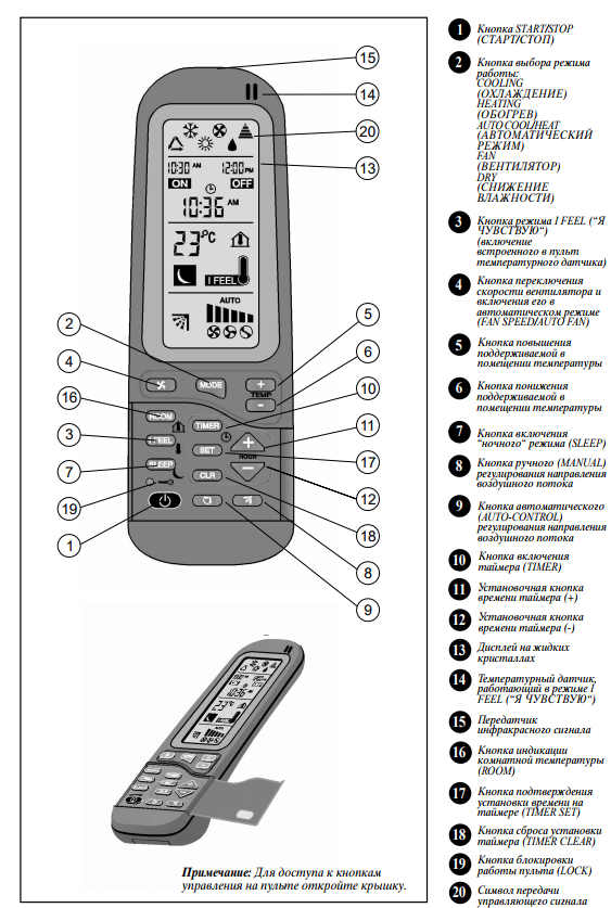 - Utilisation de la télécommande du climatiseur Electra. Sur le clavier de la télécommande, il peut y avoir des fonctions supplémentaires qui peuvent ne pas être disponibles pour certains modèles car la télécommande est universelle pour toute la ligne. La section couvre le but de chaque bouton, comment définir certains paramètres, allumer la minuterie et même comment changer les piles. Toute la section est illustrée en détail.