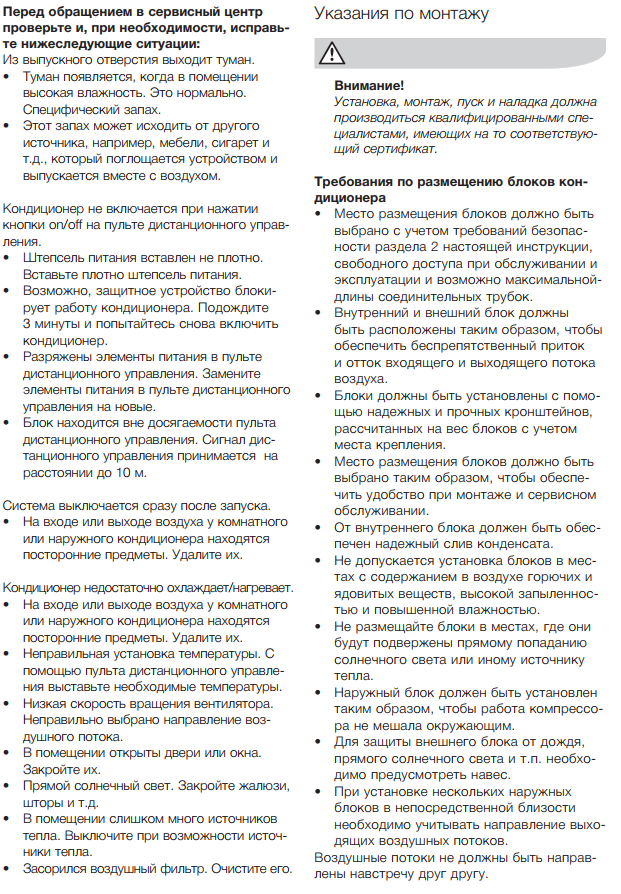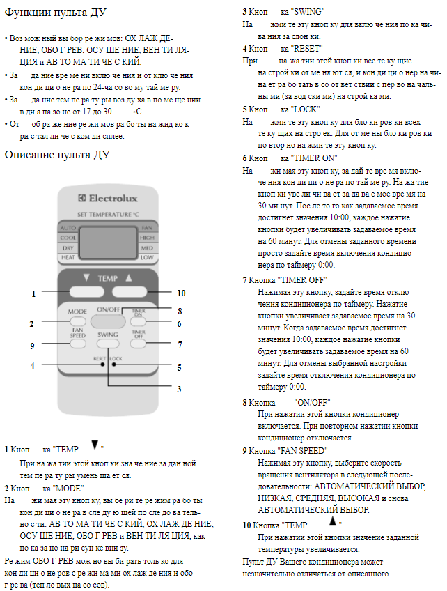 Comment utiliser la télécommande et les principales caractéristiques de son appareil, les nuances de fonctionnement, une description de la conception du système et les conditions de contact avec un centre de service sont décrits dans les instructions des climatiseurs electrolux. Il contient également les schémas de connexion des appareils, les copies des certificats, la garantie et les adresses des services les plus proches.
