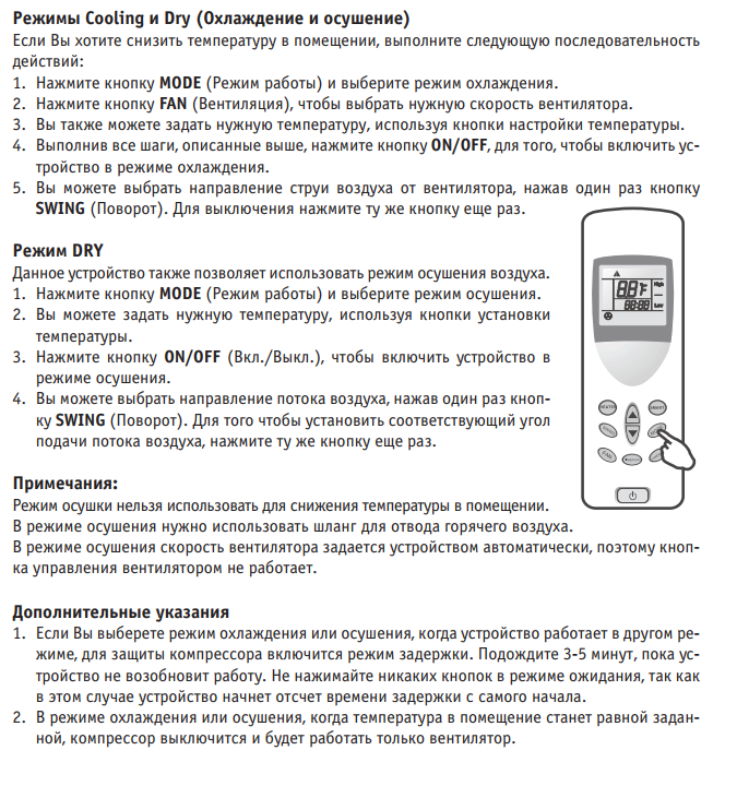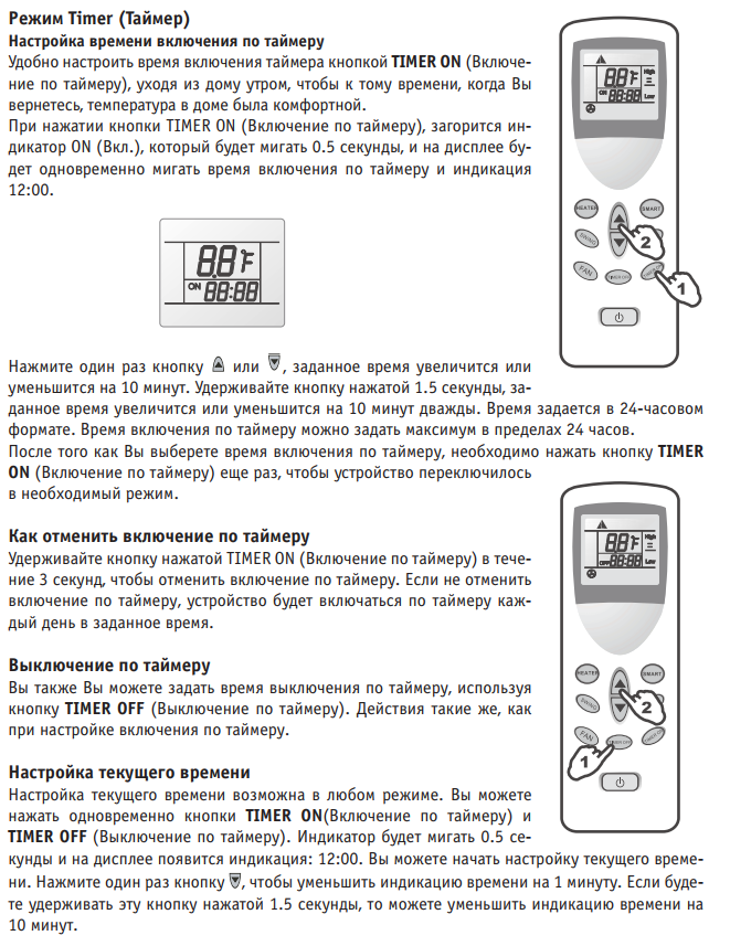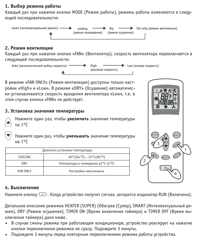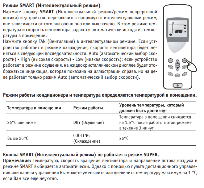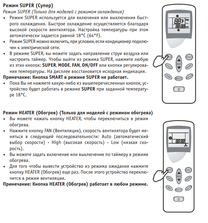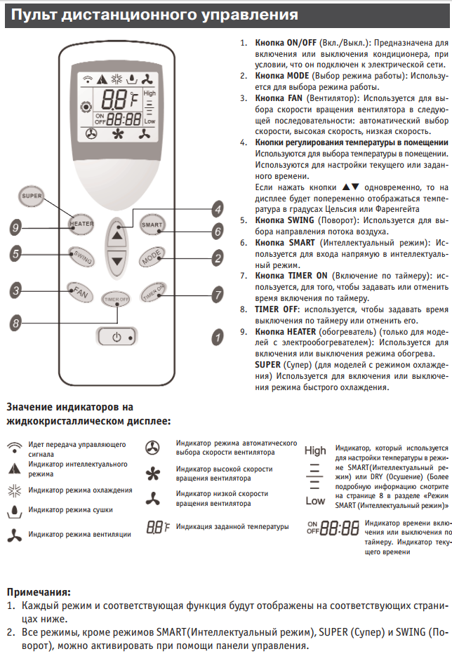 L'utilisation de la télécommande vous permet de régler non seulement le régime de température, mais également l'intensité de l'alimentation en air. Pour ce faire, il suffit d'étudier les explications des symboles et symboles utilisés à la surface du panneau de commande. Le fabricant publie un manuel en russe et comprend toutes les caractéristiques techniques de l'appareil, les précautions, ainsi que les règles standard de manipulation du matériel.
