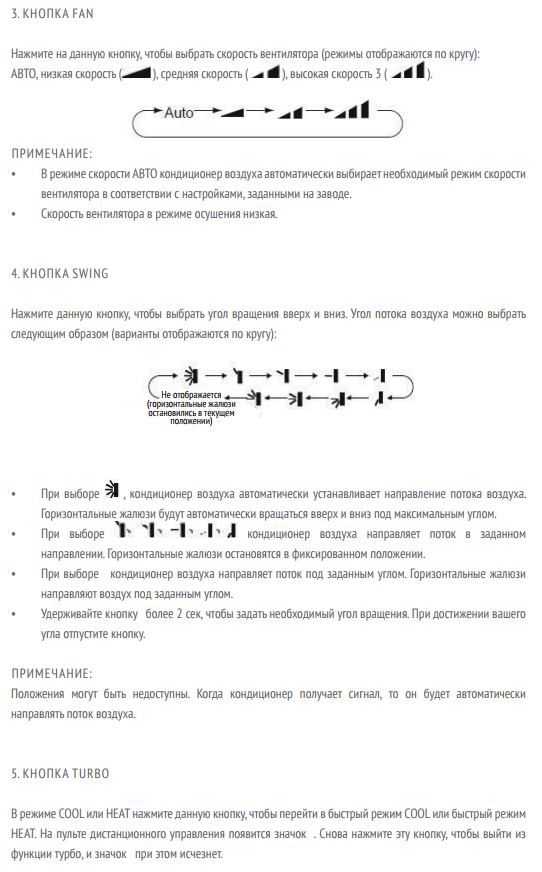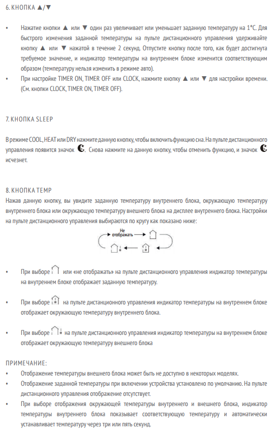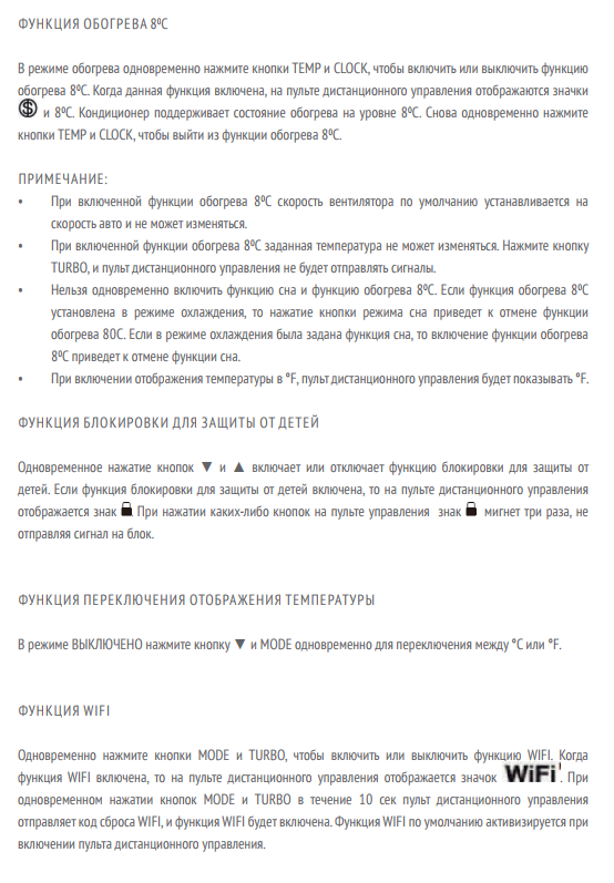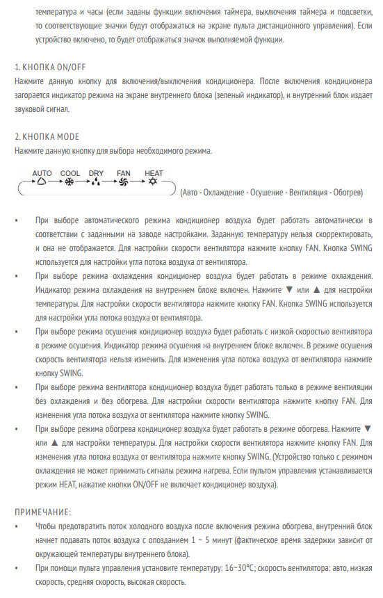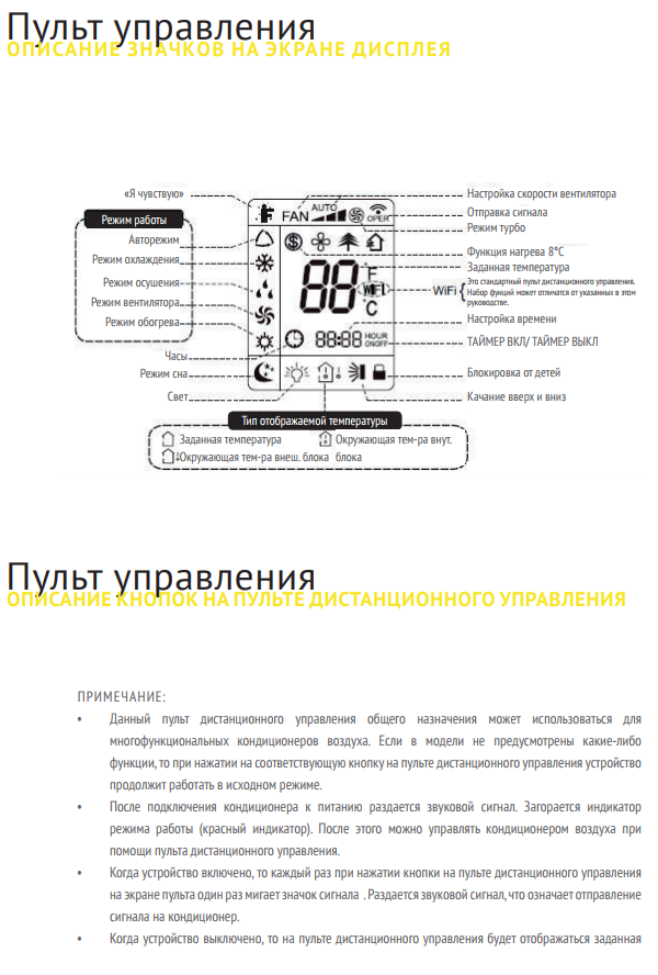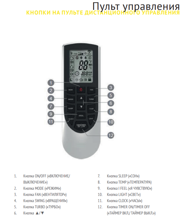 Des informations sur le mode actuel sont affichées sur l'écran du panneau de commande, l'activation des fonctions est effectuée par les boutons correspondants et est confirmée par le clignotement de l'icône de communication, ainsi que par un signal sonore. La télécommande du climatiseur est alimentée par deux piles AAA 1.5V.