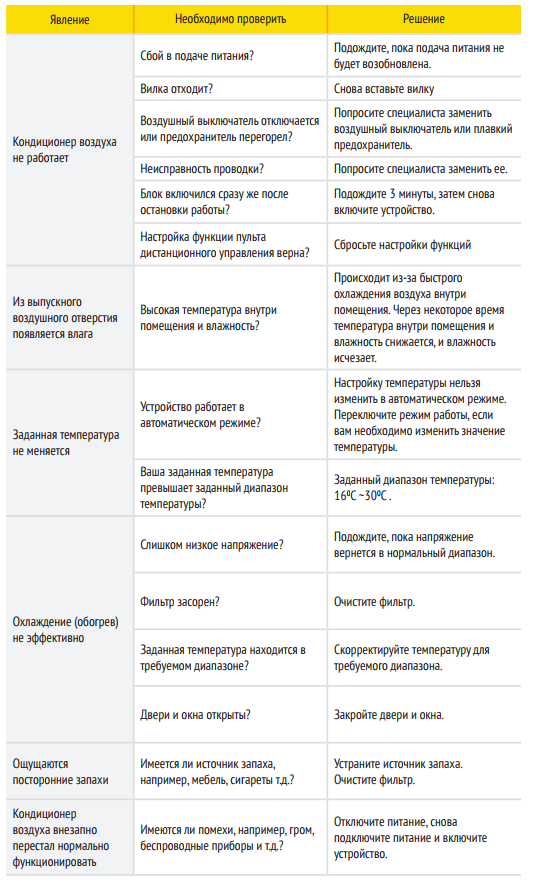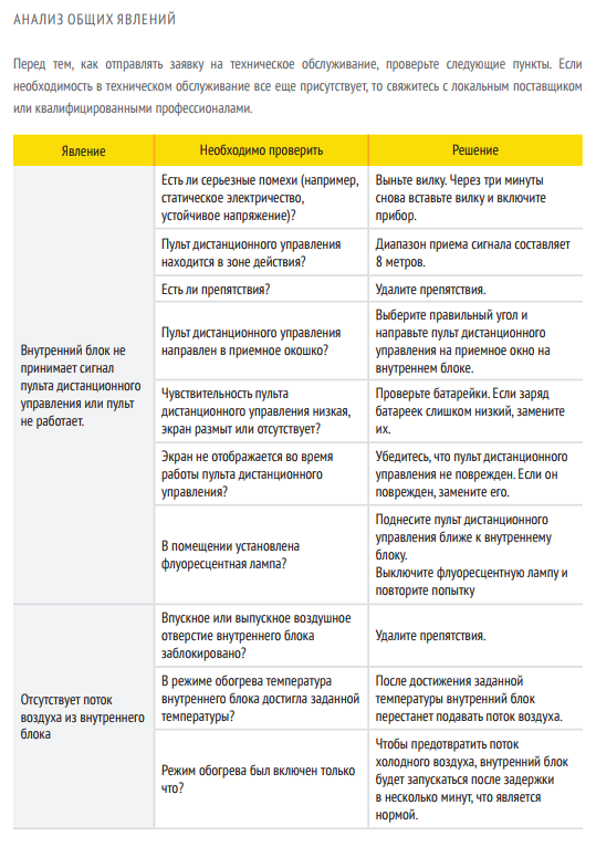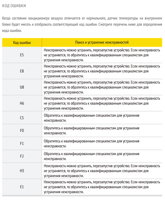 Pour résoudre le problème, dans la plupart des cas, l'utilisateur n'a besoin que de redémarrer le système divisé. Si ces mesures ne donnent pas de résultats, les instructions pour les climatiseurs recommandent fortement de contacter un centre de service disposant d'un certificat pour la fourniture de services de garantie.