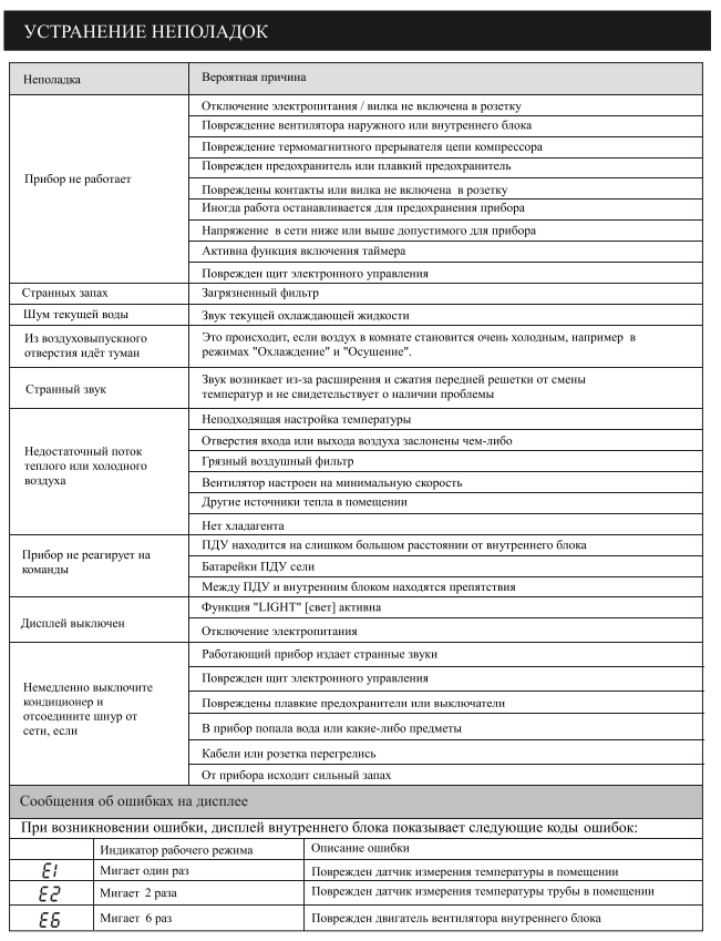 - Efficacité de refroidissement réduite. La raison en est les filtres obstrués, le niveau de réfrigérant insuffisant, le mode de fonctionnement mal réglé, il y a un courant d'air dans la pièce.