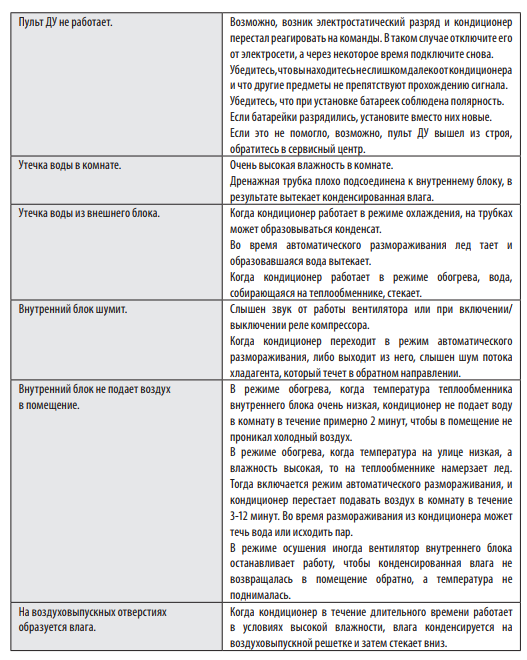 Le manuel d'utilisation contient une liste de mesures de maintenance. Il s'agit d'un facteur secondaire, mais il doit également être pris en compte. Ainsi, il est impossible de remplir le liquide de refroidissement sans les compétences et la connaissance appropriées de l'équipement. Mais si les débris pénètrent dans le canal de drainage externe, il doit être nettoyé. Vous n'avez pas besoin d'appeler des spécialistes pour cela. Une exception est la contamination du radiateur ou d'autres composants critiques de l'unité extérieure.