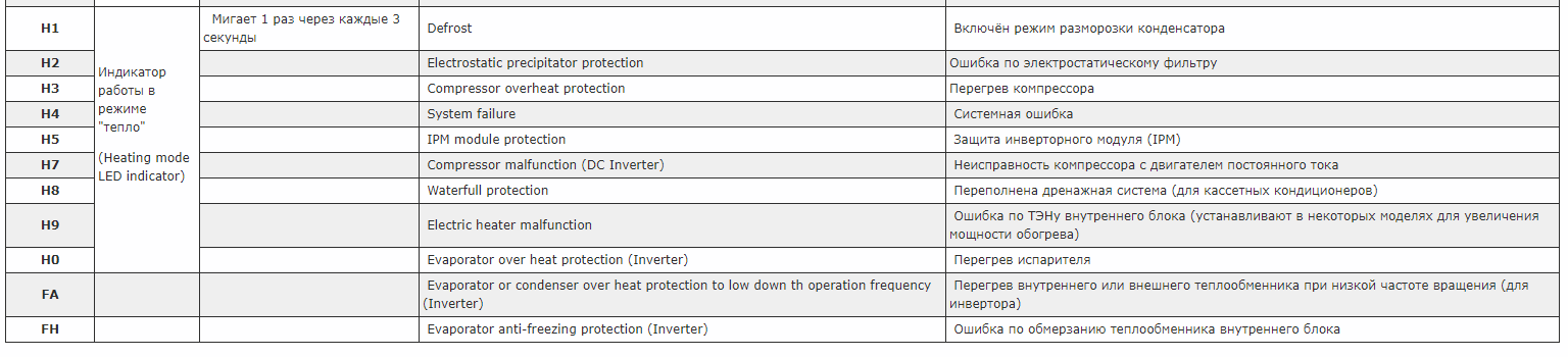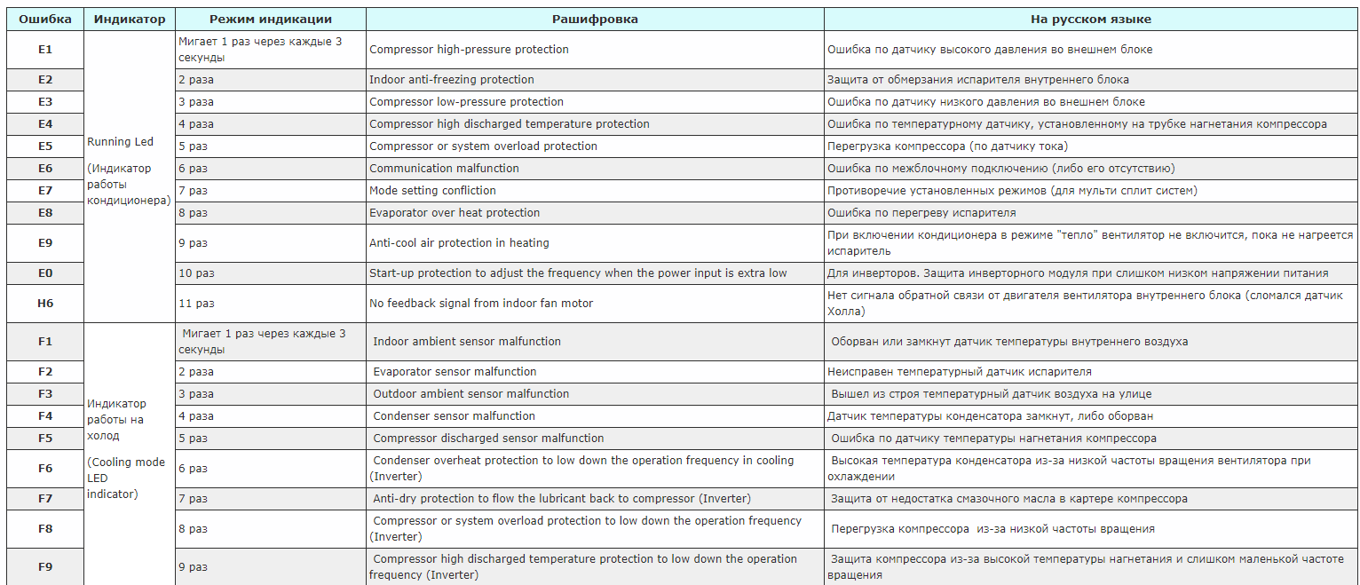 Dans les climatiseurs domestiques, l'erreur peut être dupliquée par des indicateurs clignotants (général, froid, chaud) toutes les 3 secondes. Le nombre est déterminé par le nombre de clignotements.