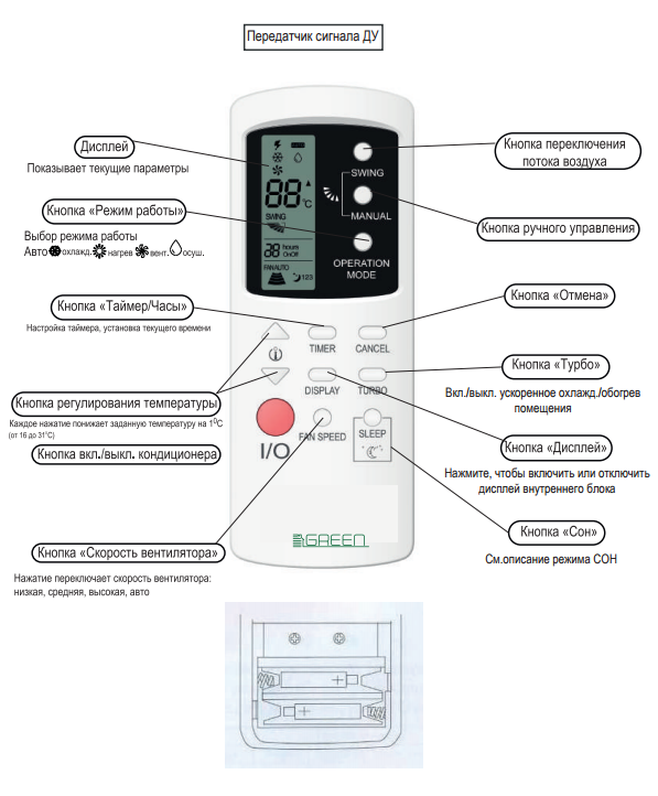 Pour un confort d'utilisation maximal, à l'aide de la télécommande fournie, les climatiseurs peuvent être configurés dans les modes "Smart", "Super" et "Sleep". Cet équipement climatique est équipé d'un système de filtres internes, grâce auquel l'air acquiert non seulement une pureté parfaite, mais également une fraîcheur irréprochable. Le flux d'air volumétrique se produit automatiquement, uniformément en raison du bon fonctionnement de la grille à persiennes avant. S'il y a une désignation "HS" sur l'étiquetage des équipements HVAC de la marque GREEN, cela indique la présence d'un compresseur à onduleur de la catégorie "start-stop".