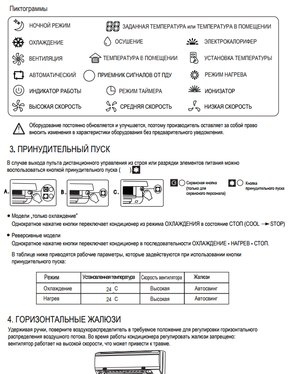 Les instructions pour les climatiseurs sont compilées de manière à ce que même un non-professionnel puisse comprendre les paramètres, les paramètres de mode et le débogage initial de l'équipement. Les conseils et règles d'utilisation de la technologie inclus dans le contenu du manuel vous permettent d'éviter des pannes indésirables pendant le fonctionnement.