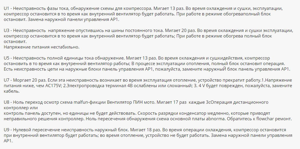 Dans le travail de tout équipement, des dysfonctionnements et des pannes sont possibles. Les codes d'erreur mis en évidence des climatiseurs vous permettent de déterminer des dysfonctionnements tels que :