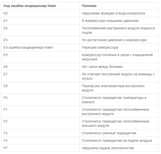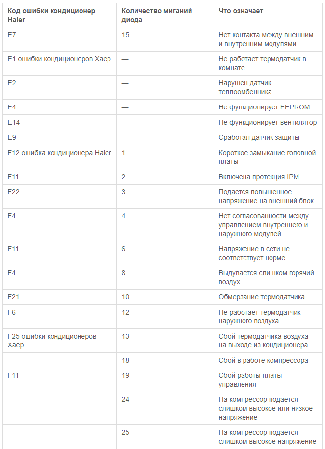 Si le climatiseur est installé correctement, aucune panne inattendue ne devrait se produire dans son fonctionnement. Si la connexion de l'appareil n'a pas été effectuée conformément aux règles, le réglage de ses modes de fonctionnement a été effectué non conformément aux instructions, mais au hasard, la maintenance et le nettoyage ne sont pas effectués, alors un tel climatiseur cesse de fonctionner, affichant codes d'erreur pour les climatiseurs Haier sur son écran.