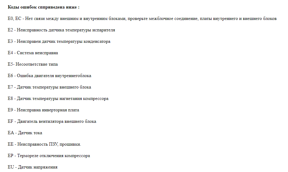 Des situations surviennent souvent lorsque des défaillances imprévues surviennent dans le fonctionnement normal des appareils climatiques. En règle générale, le manuel d'instructions contient des exemples de pannes possibles et des méthodes pour leur élimination. Les codes d'erreur des climatiseurs aideront à diagnostiquer correctement le dysfonctionnement qui s'est produit.