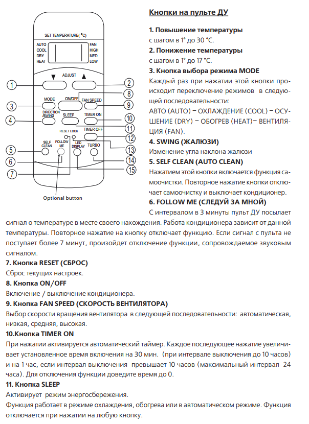 - Conseils pour la télécommande. La télécommande du climatiseur est universelle pour une série de modèles, de sorte que le climatiseur peut ne pas avoir de fonctions présentes sur le panneau de boutons de la télécommande. Il n'est pas recommandé de laisser les piles dans la télécommande si vous n'avez plus besoin de l'utiliser. Les batteries mortes ne doivent pas être jetées au feu, leur élimination doit être effectuée dans le plein respect des normes.
