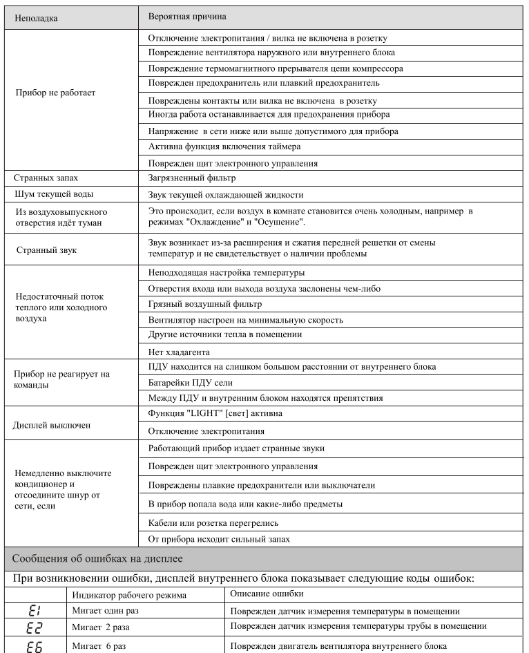 - Dépannage.En cas de sons anormaux, d'odeur de brûlé provenant du climatiseur, d'interruptions fréquentes et de redémarrages indépendants pendant le fonctionnement, ainsi que de fuites d'eau de l'unité intérieure, une réparation immédiate du climatiseur sera nécessaire. Il est recommandé d'effectuer les réparations dans des centres de service agréés.