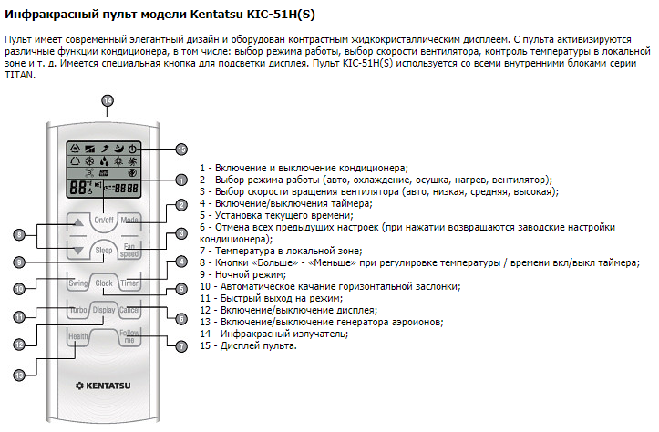 Le fabricant de climatiseurs Kentatsu Titan Genesis contient des instructions non seulement pour l'appareil lui-même, mais également pour la télécommande. Il ne sera pas difficile pour l'acheteur de le démonter.