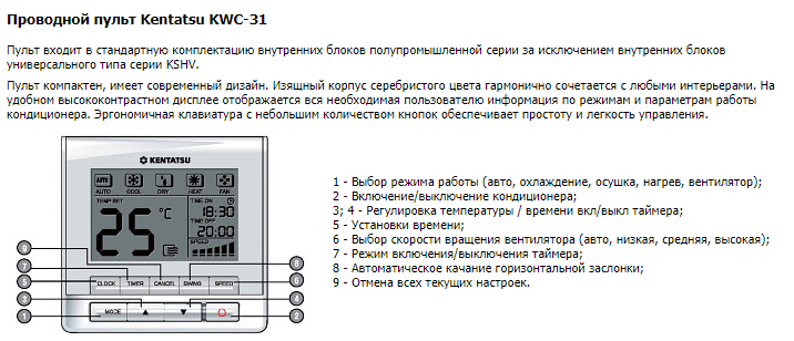Les fonctions du Kentatsu Titan Genesis et d'autres appareils muraux et de plafond sont contrôlées par une télécommande. Son utilisation permet de régler les indicateurs de température souhaités, rapidement et n'importe où dans la pièce pour changer de mode de fonctionnement : le système refroidit ou chauffe l'air, fonctionne comme un ventilateur. A l'aide de la télécommande, il sera possible non seulement de régler les paramètres, mais aussi de régler le fonctionnement de la minuterie, en mode automatique.