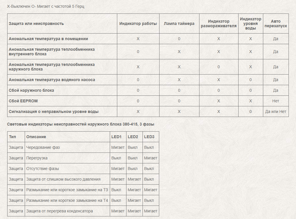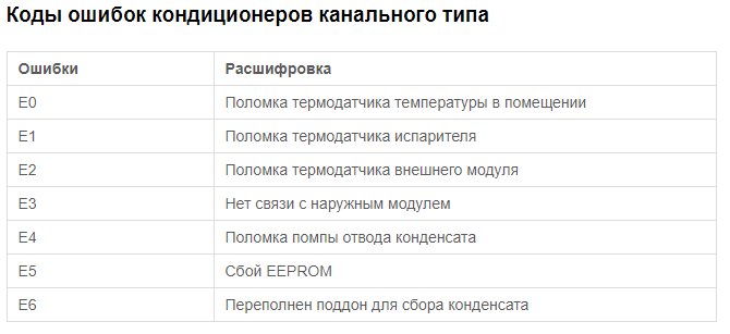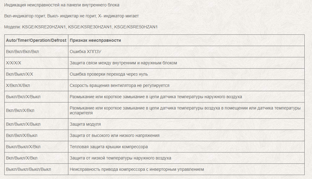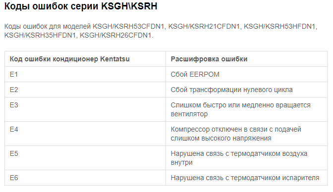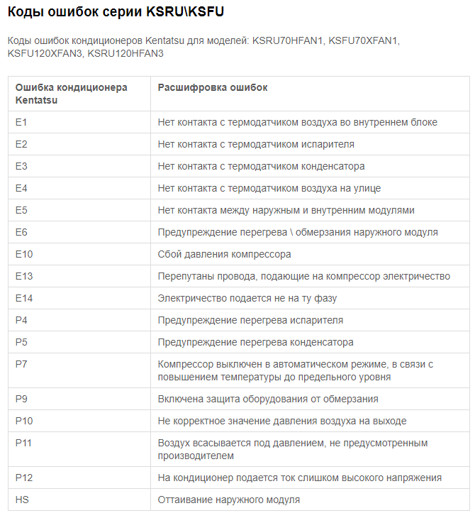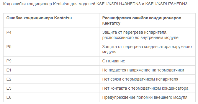 La plupart des modèles de climatiseurs sont équipés d'une fonction d'auto-diagnostic. En cas de dysfonctionnement, l'appareil affiche un code correspondant à cette erreur sur l'afficheur. Les codes d'erreur des climatiseurs kentatsu sont précisés dans les instructions de l'équipement. Cette méthode de notification d'une panne permet au propriétaire du climatiseur de détecter le dysfonctionnement à temps, et au maître - de déterminer ce qui l'a exactement causé.