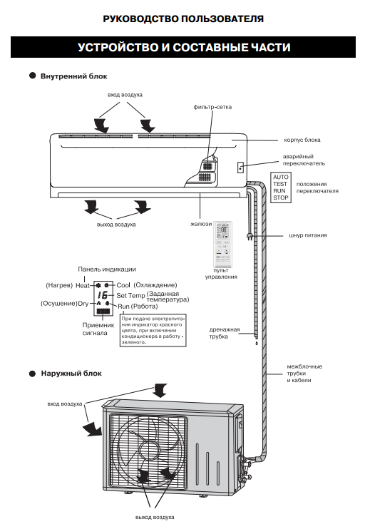 Tout modèle se compose d'unités intérieures et extérieures. Le premier contient le compresseur, le radiateur et le ventilateur. Dans le second, il y a un radiateur et un ventilateur.Pendant le processus d'installation, ces composants sont reliés par une canalisation en cuivre. Grâce à cette pièce, un mélange d'huile de compresseur et de fréon circule. Le fonctionnement des ventilateurs fournit un flux d'air aux radiateurs, ce qui améliore l'échange thermique et la répartition uniforme de l'air froid dans la pièce climatisée.