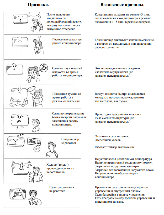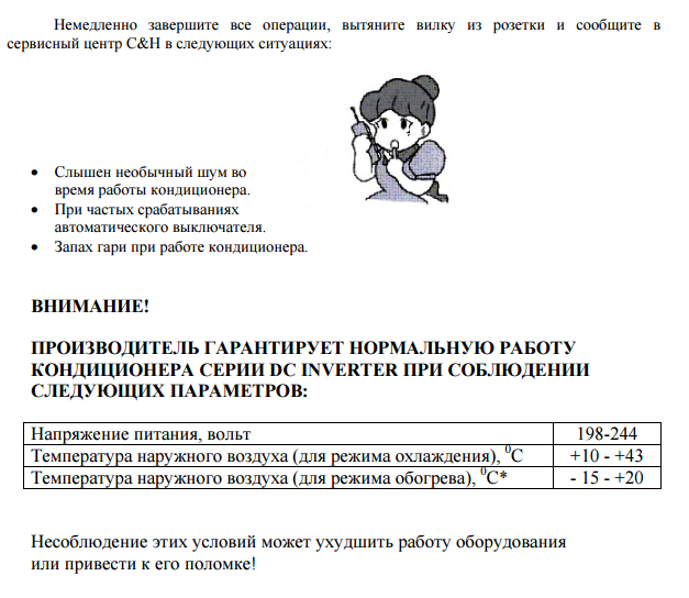 De la description ci-dessus, nous pouvons conclure que pour que le climatiseur dure suffisamment longtemps, c'est-à-dire au moins sept ans, il est nécessaire de nettoyer les filtres tous les mois, en cas de panne, contactez le service après-vente à temps. Aussi, n'utilisez pas l'équipement si la température ambiante est inférieure à -10°C.