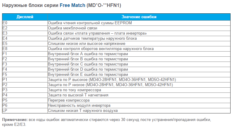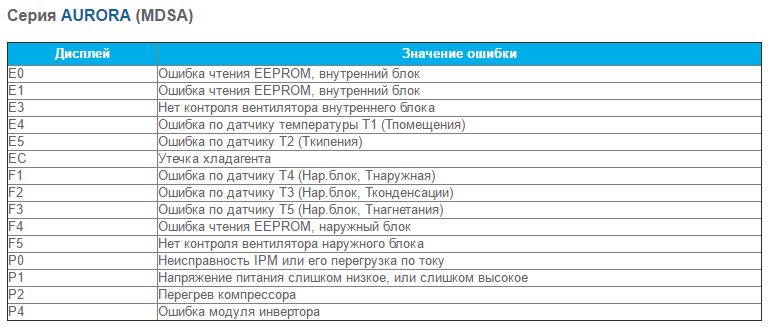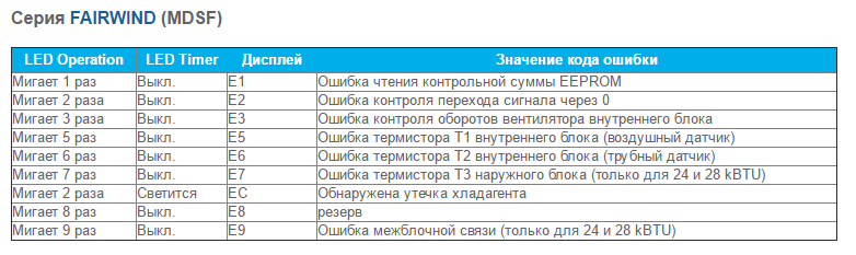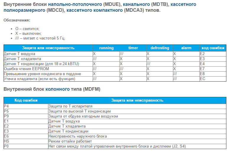 Les codes d'erreur détaillés pour chaque modèle sont indiqués dans le manuel d'utilisation. Il contient également des informations sur la façon de résoudre vous-même certains défauts et problèmes. Une liste complète des codes peut être trouvée dans les documents de référence pour les climatiseurs Midea - la plupart des combinaisons de signaux LED sont les mêmes que les produits MDV.