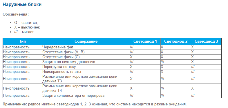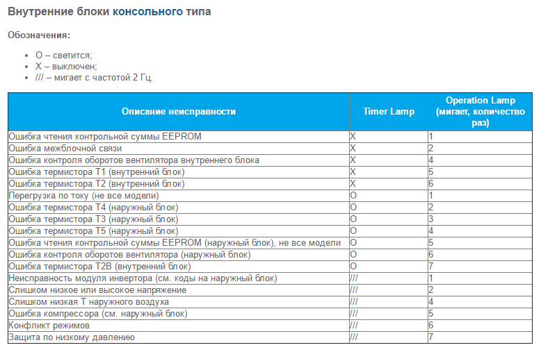 La plupart des défauts et erreurs sont identifiés par le système de contrôle interne de l'appareil, et les codes correspondants, séparés pour l'unité intérieure et extérieure, sont indiqués par des LED sur les panneaux et les panneaux de commande. La LED peut être allumée, clignotante, et la combinaison spécifique indique la nature de l'erreur. Ceux-ci peuvent être des prérequis pour nettoyer, régler ou même réparer l'appareil lorsqu'il ne réagit pas du tout aux programmes de commande.