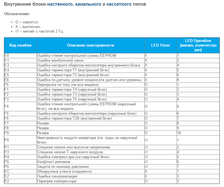 Parfois, les codes d'erreur de blocage indiquent directement un dysfonctionnement de l'équipement associé. Par exemple, lorsque l'indicateur d'alarme clignote lentement sur l'unité intérieure, cela signifie que le climatiseur ne s'allume pas en raison d'un dysfonctionnement de l'unité extérieure. Inversement, une LED similaire à l'extérieur est un code d'erreur indiquant des problèmes avec l'unité intérieure. Vous devrez peut-être même changer certaines pièces.