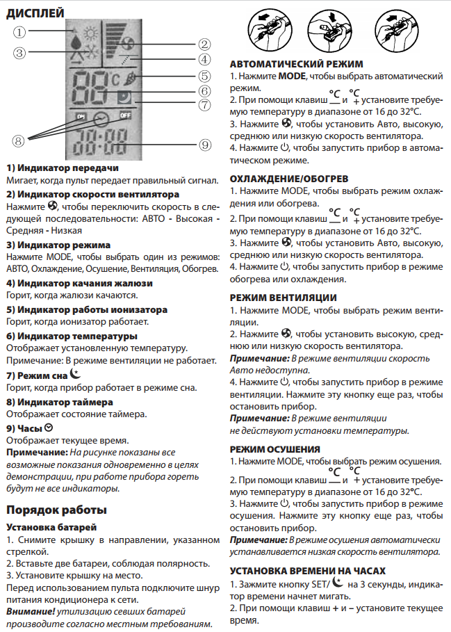 Vous trouverez plus de détails sur le fonctionnement de la télécommande dans les instructions des climatiseurs. Si le signal de la télécommande faiblit ou est complètement perdu et que les symboles sur l'écran deviennent flous, cela indique qu'il est temps de changer les piles. Lors du changement de piles, il est important de ne pas confondre la polarité et de n'utiliser que des piles de haute qualité.