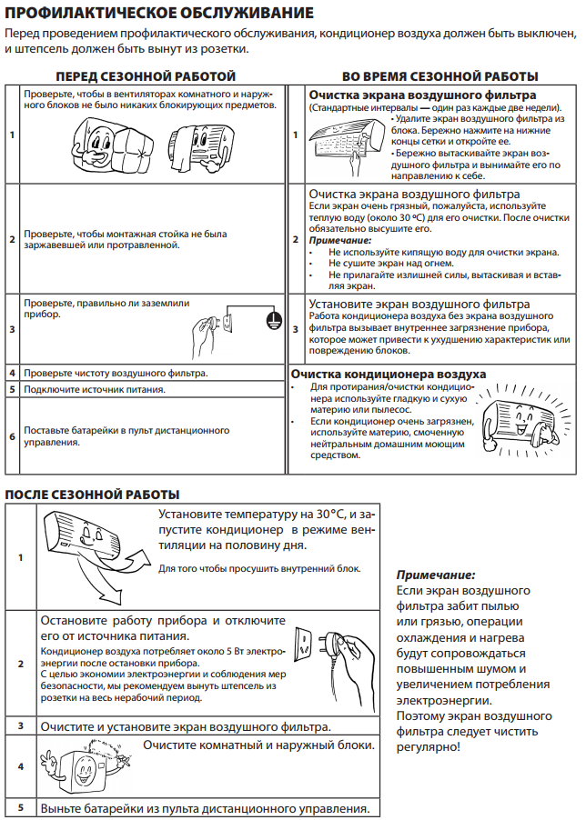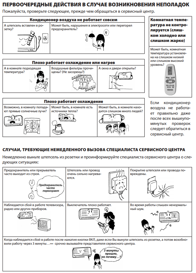 L'installation et la connexion professionnelles des systèmes de climatisation, la maintenance en temps opportun, le fonctionnement de l'appareil conformément au manuel d'utilisation sont trois composants d'un fonctionnement prolongé du climatiseur. Le moyen le plus simple est d'utiliser les services d'une entreprise qui vend de la technologie climatique, vous pouvez également contacter un centre de service spécialisé. Les dysfonctionnements liés à une installation de climatisation de mauvaise qualité se produisent plusieurs fois plus souvent. Cependant, des dommages sont possibles même avec un appareil correctement installé. Lorsque les premiers signes d'un dysfonctionnement sont détectés, il est recommandé d'arrêter d'utiliser l'appareil et d'appeler d'urgence un assistant d'un centre de service spécialisé.