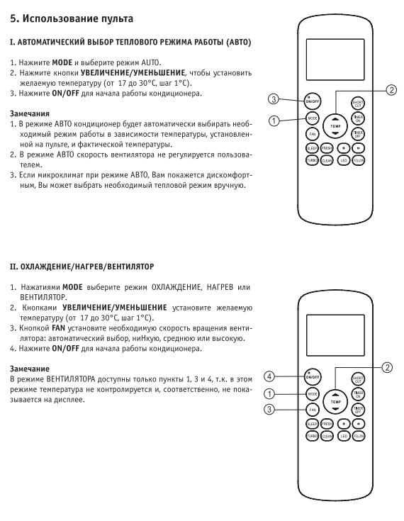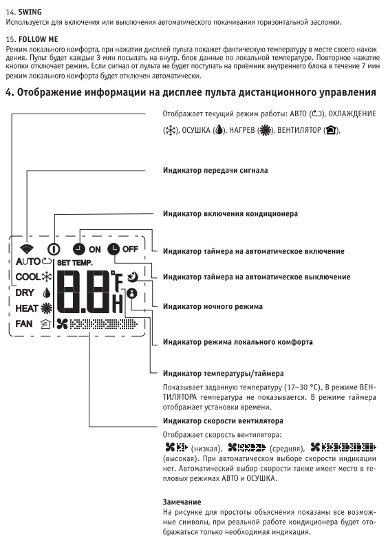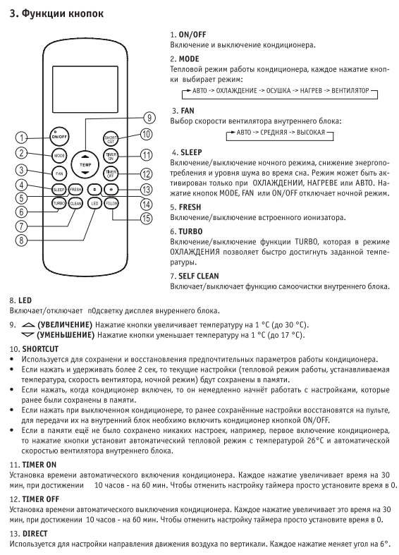 La télécommande est utilisée pour contrôler le climatiseur, changer de mode de fonctionnement, augmenter/diminuer la température et connecter d'autres fonctions. Il est facile à utiliser et possède des boutons familiers à tous les utilisateurs de systèmes de climatisation. Même ceux qui ont acheté un appareil Leberg pour la première fois peuvent facilement comprendre le panneau de commande :