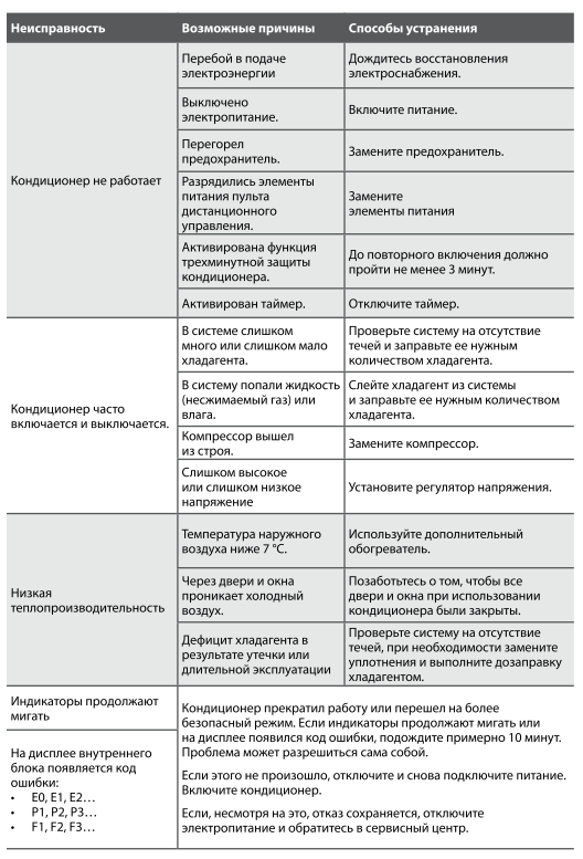 Presque tous les appareils de la marque Lieberg disposent d'un système d'autodiagnostic qui aide les utilisateurs à déterminer eux-mêmes la panne. Les codes d'erreur du climatiseur qui apparaissent sur l'écran identifieront la cause exacte du problème. Si le modèle ne dispose pas d'un système de diagnostic, un indicateur objectif de fonctionnement peut aider à contacter un spécialiste à temps: