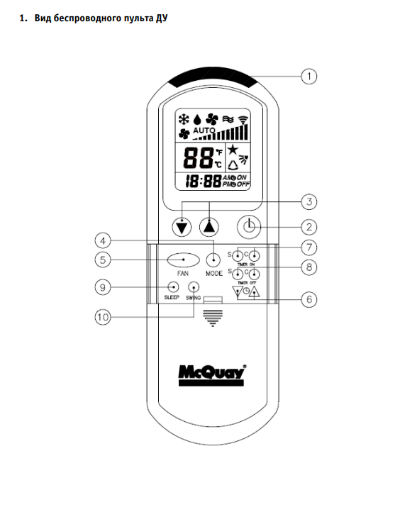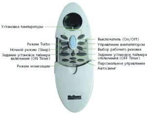 - Bouton marche et arrêt - généralement situé dans le coin supérieur gauche, est responsable du démarrage du climatiseur.
