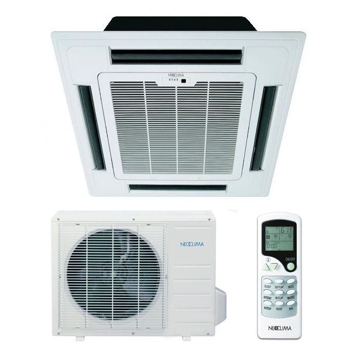- Cassette - des produits faciles à utiliser pour les grandes pièces. Ils sont installés au plafond de locaux principalement non résidentiels et contribuent à maintenir l'intégrité de l'intérieur tout en assurant un confort adéquat. Le seul inconvénient des produits à usage industriel est qu'un plafond suspendu est nécessaire pour l'installation des climatiseurs. Le climatiseur à cassette de Neoclima fonctionne très silencieusement et régule 7 directions de flux d'air.
