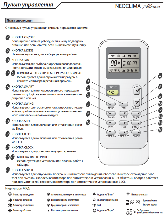 Le réglage des paramètres s'effectue à l'aide des boutons "+" et "-". Vous pouvez en savoir plus sur le contrôle dans les instructions du climatiseur Neoclima de votre modèle.