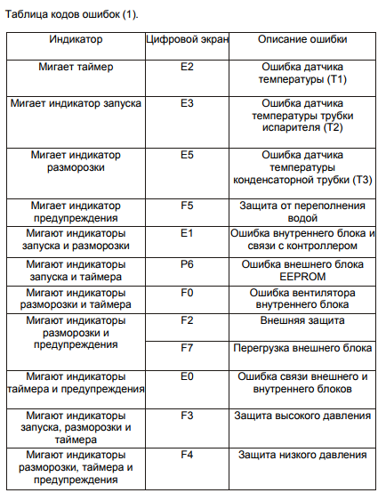 Si votre appareil n'émet pas l'un des codes non répertoriés ci-dessus, vous devez le trouver dans le passeport de l'appareil technique ou appeler le centre de service ou la hotline du fabricant pour une consultation et une réparation ultérieure du climatiseur.