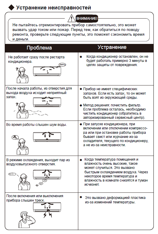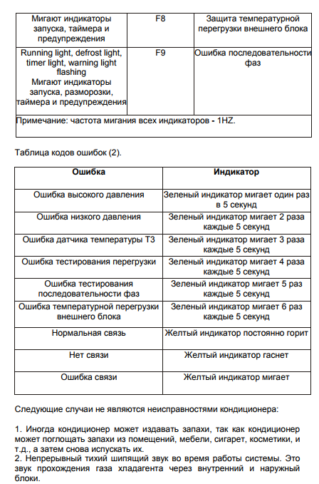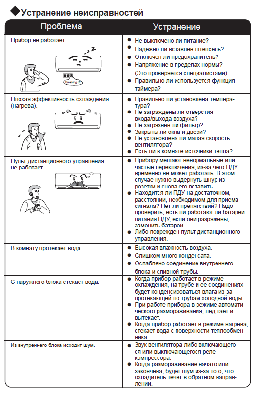 - Lorsqu'il est appliqué, il y a des problèmes, à la suite desquels le climatiseur peut s'éteindre tout seul après un fonctionnement prolongé.