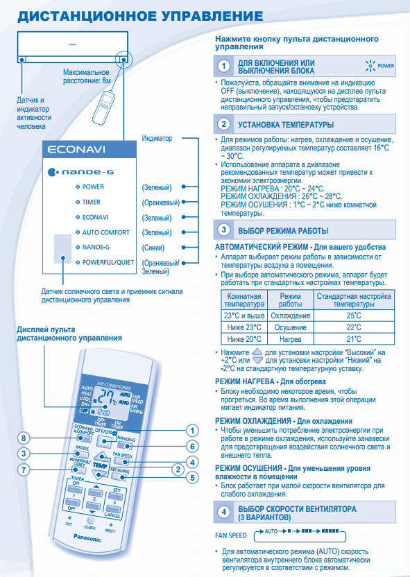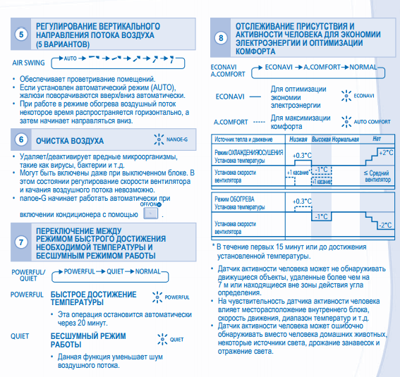 Le manuel des climatiseurs Panasonic fait partie intégrante du kit de tout climatiseur de cette marque. Il sert d'aide visuelle pour l'équipe de montage et de manuel d'utilisation pour l'utilisateur. Cette documentation technique contient des informations sur le fonctionnement de l'appareil, sur la fréquence de ravitaillement et de nettoyage des filtres de l'équipement, sur le type de fréon rempli, ainsi que sur le calendrier de l'entretien périodique dans les centres de service. dans les instructions, vous pouvez trouver un schéma avec les noms de tous les boutons principaux qui contiennent une télécommande pour le climatiseur Panasonic. Si l'instruction est perdue pour une raison quelconque, la photo montre une description de tous les boutons avec leur fonction.