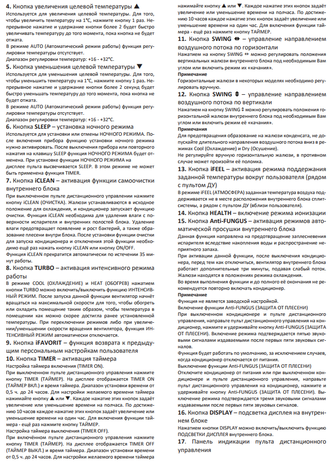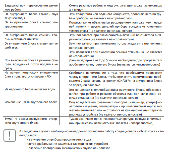 Un filtre à tamis ondulé est utilisé pour une filtration fiable de l'air. Les modèles sont équipés d'un évaporateur à multiples facettes, d'une fonction de dégivrage et de déshumidification intelligente. Les appareils ont une minuterie qui vous permet d'éteindre les appareils à une heure précise. Il est important que les systèmes split soient équipés d'un mode diagnostic.