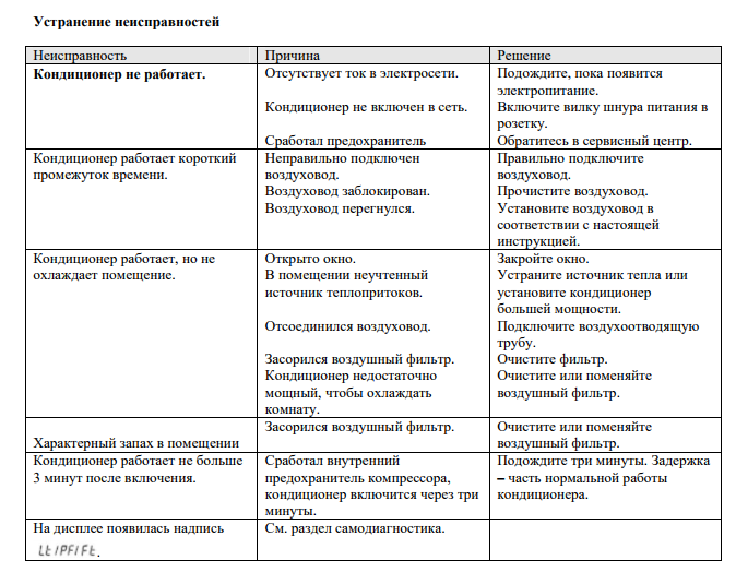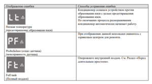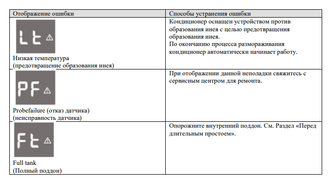 Vous pouvez découvrir l'apparition d'un dysfonctionnement en voyant le code sur l'écran lors de la mise sous tension ou pendant le fonctionnement. Certains modèles ont une fonction d'autodiagnostic, ce qui facilite grandement le travail de l'assistant. Les codes d'erreur du climatiseur sont reflétés dans les instructions. En cas de panne, l'écran affiche un code correspondant au problème en cours. En voyant le code d'erreur, l'assistant peut décider de livrer l'appareil à un centre de service ou de résoudre le problème sur place. Des diagnostics supplémentaires ne sont pas nécessaires.