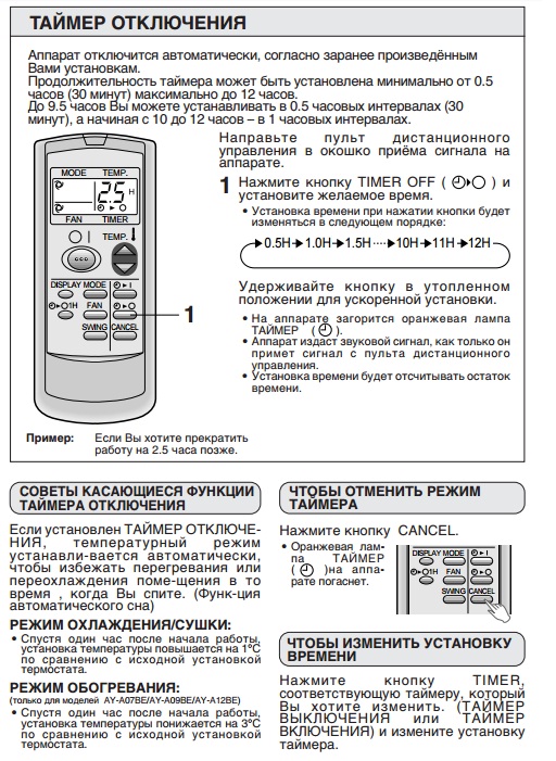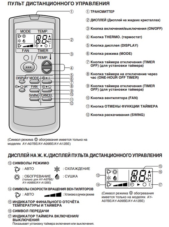 Pour les régions aux hivers froids, il est recommandé d'acheter des systèmes split avec une fonction de dégivrage par glace sur une unité extérieure. Il est disponible pour les modèles AY-A07BE, AY-A09BE et AY-A12BE.