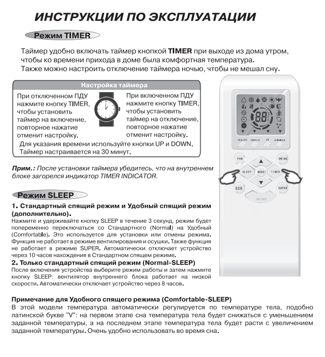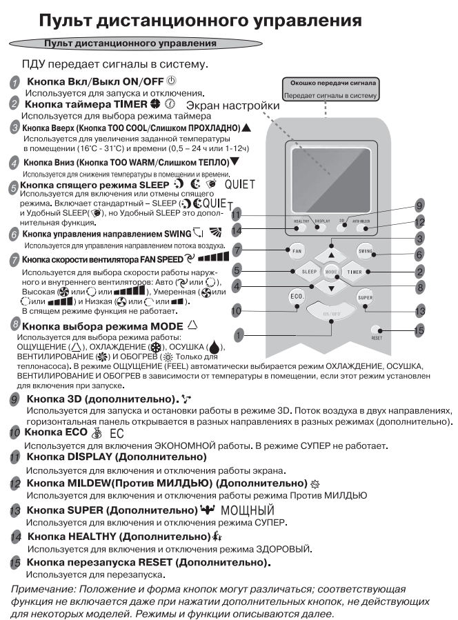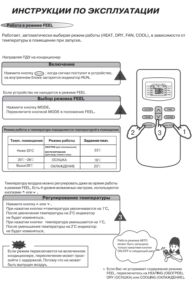 - Modes de travail. Manuel détaillé pour les modes supplémentaires du climatiseur. Que fait FEEL, comment activer les modes HEAT, DRY, FAN, COOL et comment régler les modes TIMER et SLEEP.