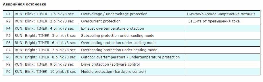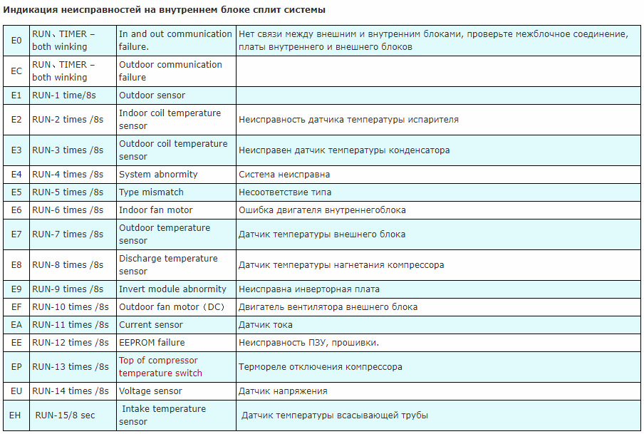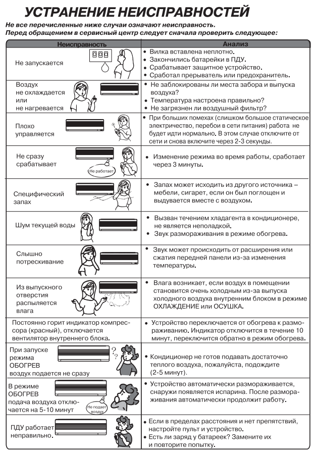 Des problèmes peuvent survenir pendant le fonctionnement ou le démarrage du climatiseur. De nombreux modèles ont un système d'auto-diagnostic qui affiche divers codes d'erreur de climatiseur ou les signale d'une autre manière. En règle générale, tout dysfonctionnement accompagné d'une indication sur l'afficheur nécessitera un appel au maître. Les principaux types de défauts peuvent être grossièrement divisés en catégories :