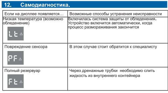 L'une des causes possibles de dysfonctionnements peut être la glace gelée à l'intérieur de l'équipement (observée lors d'un fonctionnement continu à long terme aux modes maximum). Avant d'envoyer l'appareil en réparation, il est recommandé de l'éteindre et de le décongeler pendant un certain temps (jusqu'à plusieurs heures). Si les performances ne sont pas restaurées, vous devez contacter le maître.