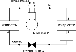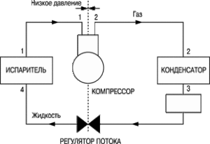 Par des changements cycliques de la pression du réfrigérant dans les tuyaux, la température du fréon et de l'air ambiant est contrôlée à travers celui-ci. L'efficacité de cette méthode de refroidissement est supérieure à celle du refroidissement par évaporation.