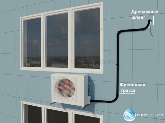 À l'intérieur de la pièce, les tuyaux de drainage des climatiseurs sont retirés dans une boîte décorative avec le reste des communications. La boîte longe le mur et sort dans la rue, où l'excès de liquide sera évacué du système.