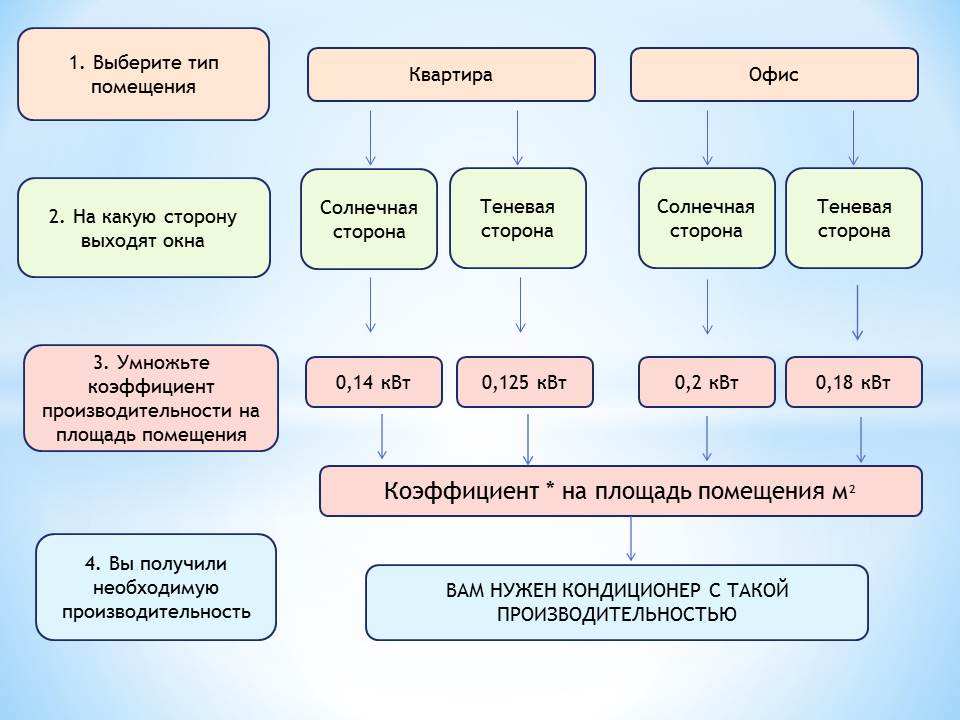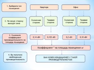Pour pré-calculer la puissance du système split, des informations sur la superficie de la pièce suffisent. Il est correct d'utiliser les données de volume, mais il est difficile de multiplier les paramètres tout de suite. Lors du calcul correct des performances, des facteurs supplémentaires sont pris en compte :